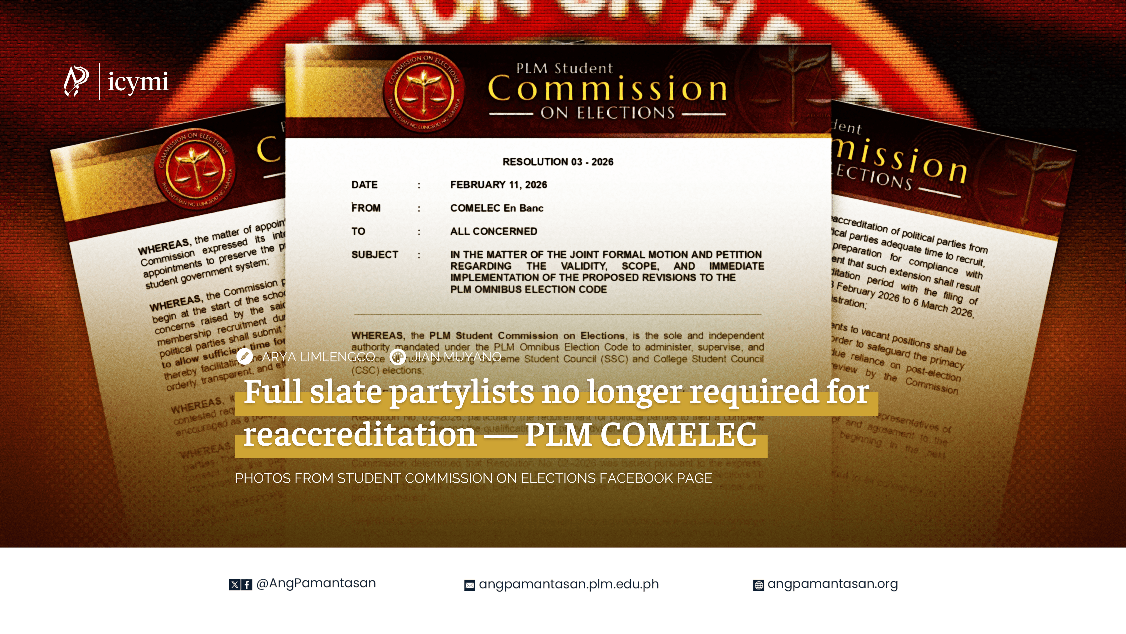Pamantasan ng Lungsod ng Maynila Student Commission on Elections (PLM COMELEC) no longer requires the full slate partylist and adviser qualifications for reaccreditation in the current electoral cycle, through newly released guidelines last Feb 11.
