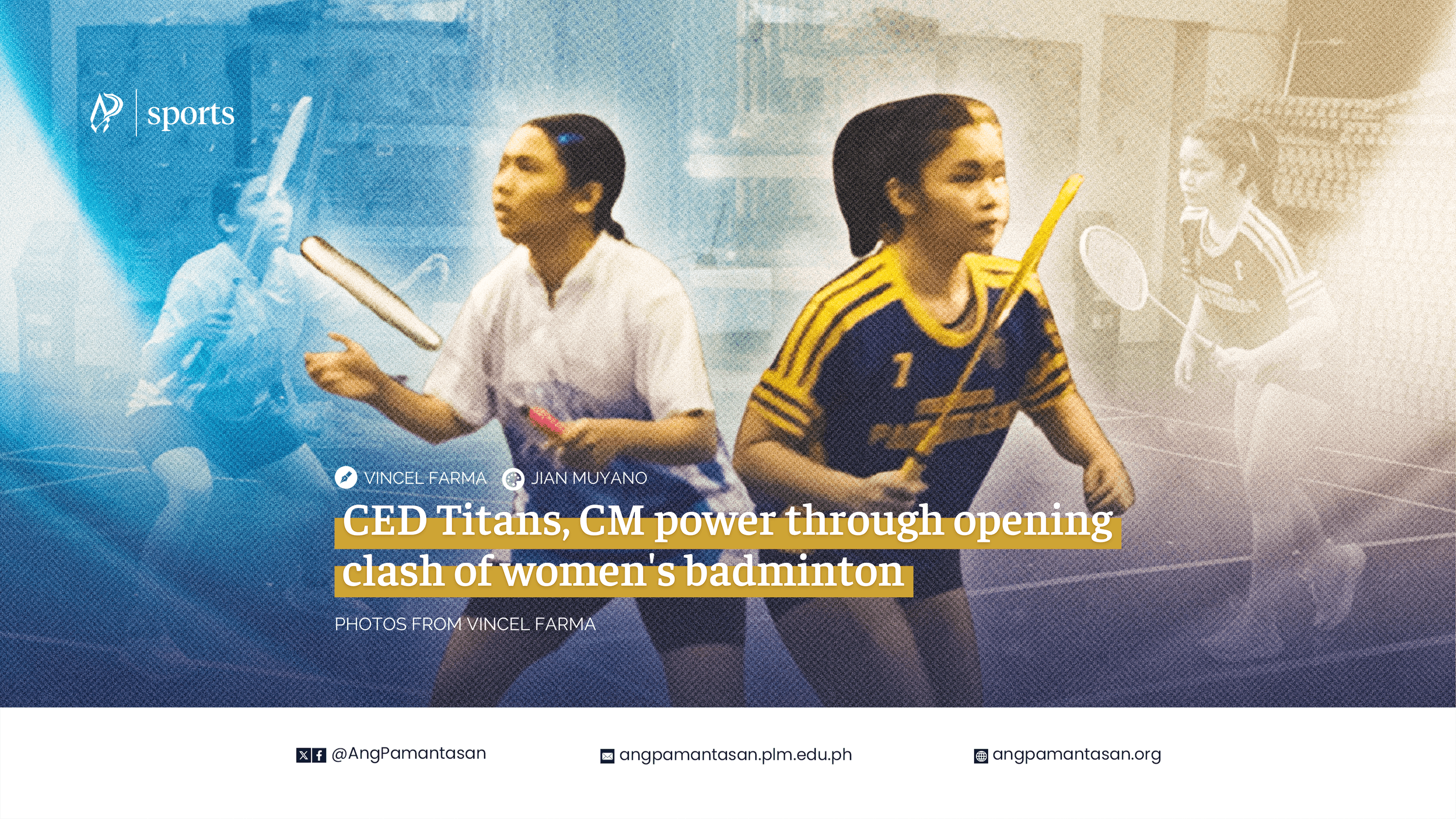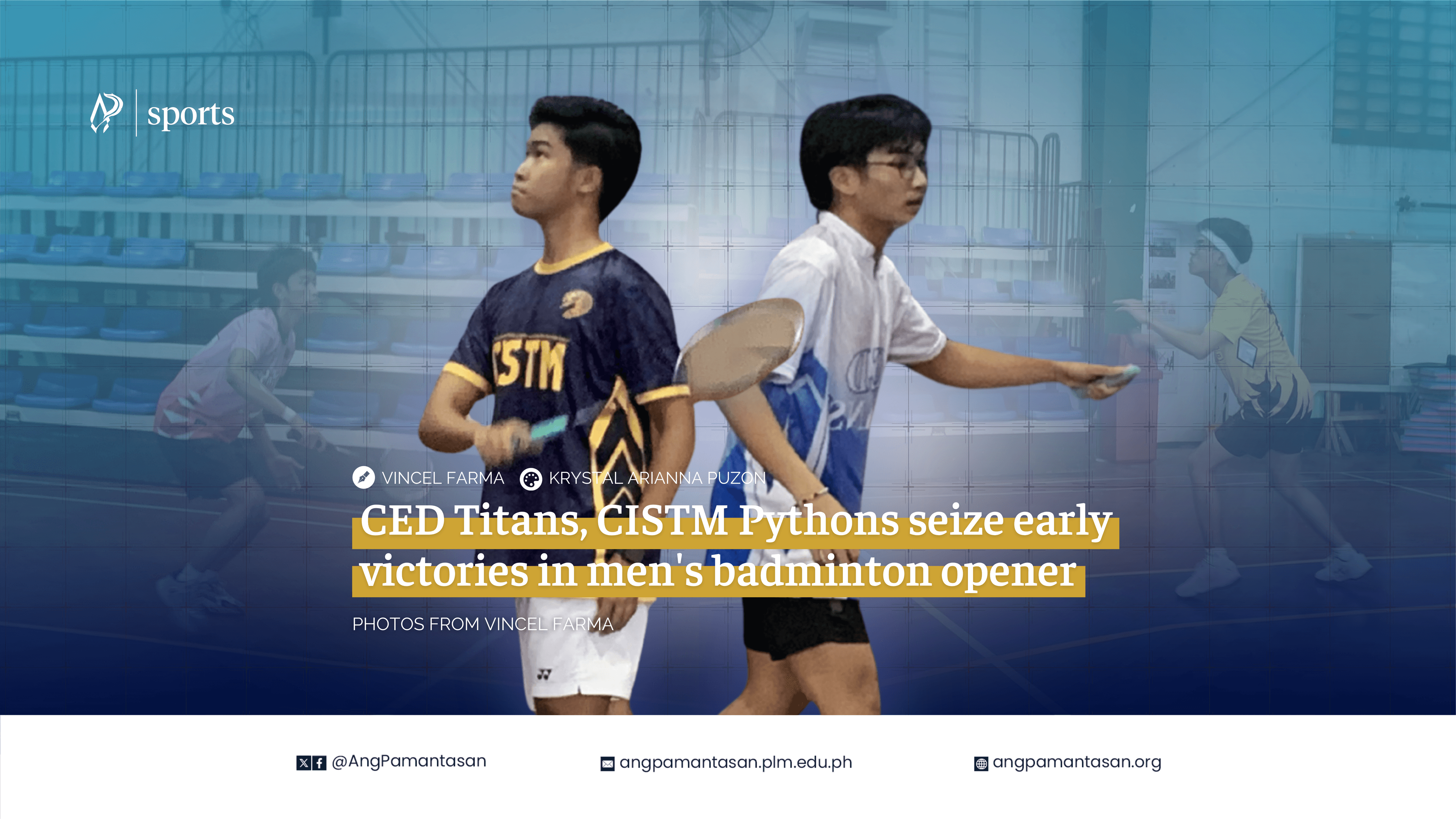 College of Education (CED) Titans’ Tristan Justin Gonzales and College of Information Systems and Technology Management (CISTM) Pythons’ Denzel Mhiko Navarro achieved smashing victories in the men's badminton opening at Rajah Sulayman Gymnasium, February 28.